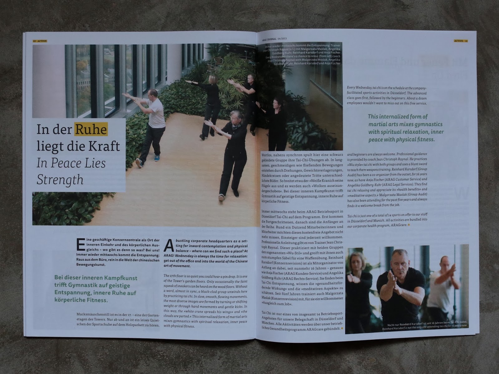 Badminton und Fußball bieten viele Unternehmen in Betriebsportgruppen an. Bei den ARAG Versicherungen trifft sich eine Gruppe jede Woche zum Tai Chi – innere Kampfkunst in der 17. Etage des ARAG Towers in Düsseldorf. Für das ARAG Journal habe ich zugesehen.